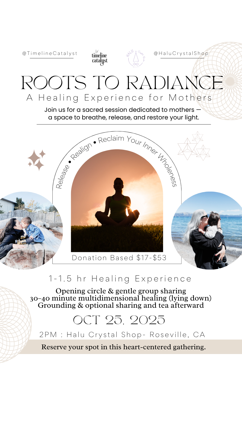 To introduce this work to the community, Timeline Catalyst is hosting “Roots to Radiance — A Healing Experience for Mothers” on October 25, 2025, at 2:00 PM at the HALU Crystal Shop in Roseville, California.